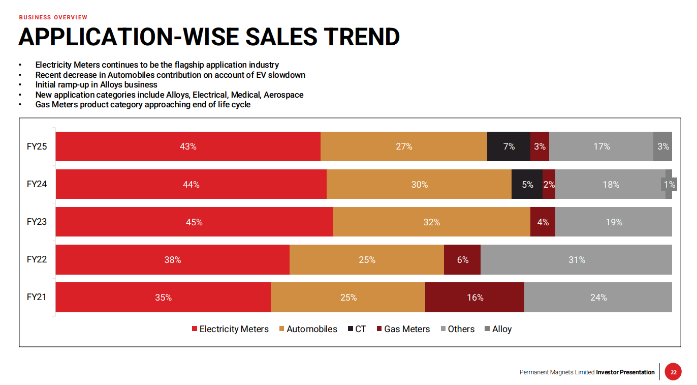 As the world moved from mechanical meters to smart meters, the company pivoted to make products to cater to smart meters. The company shifted from making traditional magnets to shunts. It added a new segment in 2021 (automotives & EVs) which has steadily grown over the last 5Ys and now commands 25-30% of total revenues.