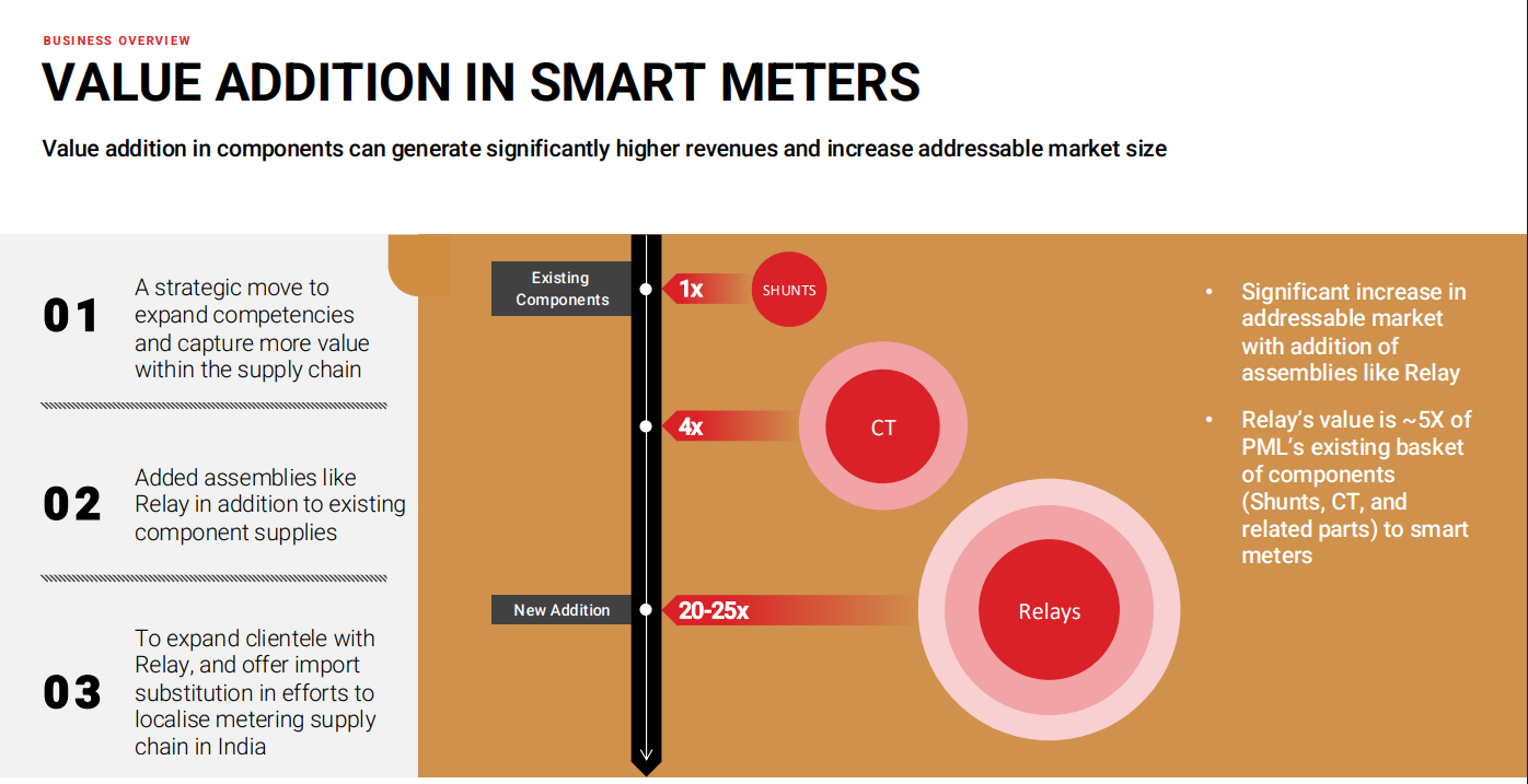 Now again, the company is transitioning from shunts to relays. The management observed that in smart meters, customers were buying assemblies of relays which included shunts and therefore the company decided to get into the relays business — to forward integrate themselves.