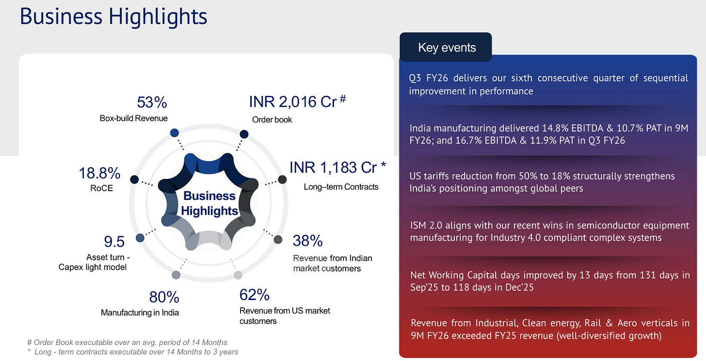 Semiconductor opportunity — Avalon has onboarded a semiconductor equipment manufacturer as a customer and will provide box build solutions that will go inside semiconductor equipments. Avalon has completed the project readiness phase ahead of volume production and expects meaningful revenues from this segment from FY27. THIS IS A MUST WATCH GOING FORWARD!