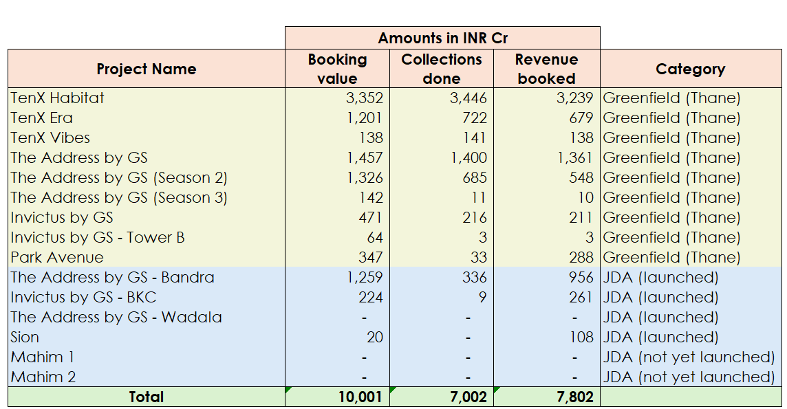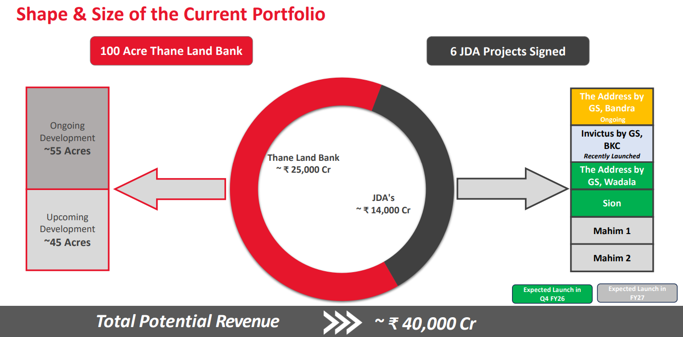 The management estimates a [cumulative] revenue potential of INR 25,000 Cr from this 100-acre land bank. Out of this 100-acre land, 55 acres is currently under development with a GDV [revenue potential] of INR 13,200 Cr.