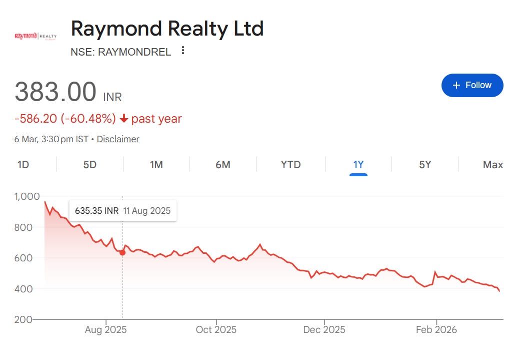 All Raymond entities are down post demerger, and the brand name is under a lot of stress — weighing down on the realty business as well, however what’s going on with the Engineering / Lifestyle businesses has no direct implication on Raymond Realty.