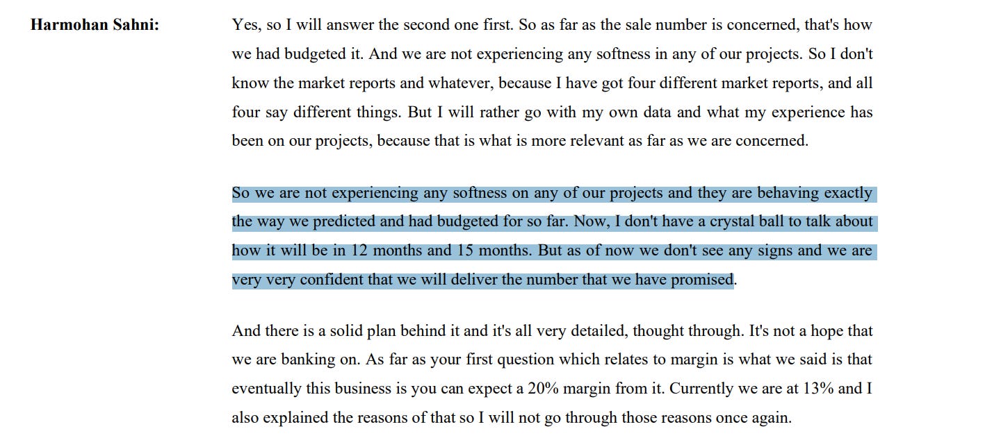 The management was VERY confident on achieving a pre-sale of INR 1,300 Cr in Q4 — and were visibly annoyed when analysts questioned them on this number. If they achieve this number in Q4, that would be a validation of management walking the talk. Accurate forecasts are a rarity.