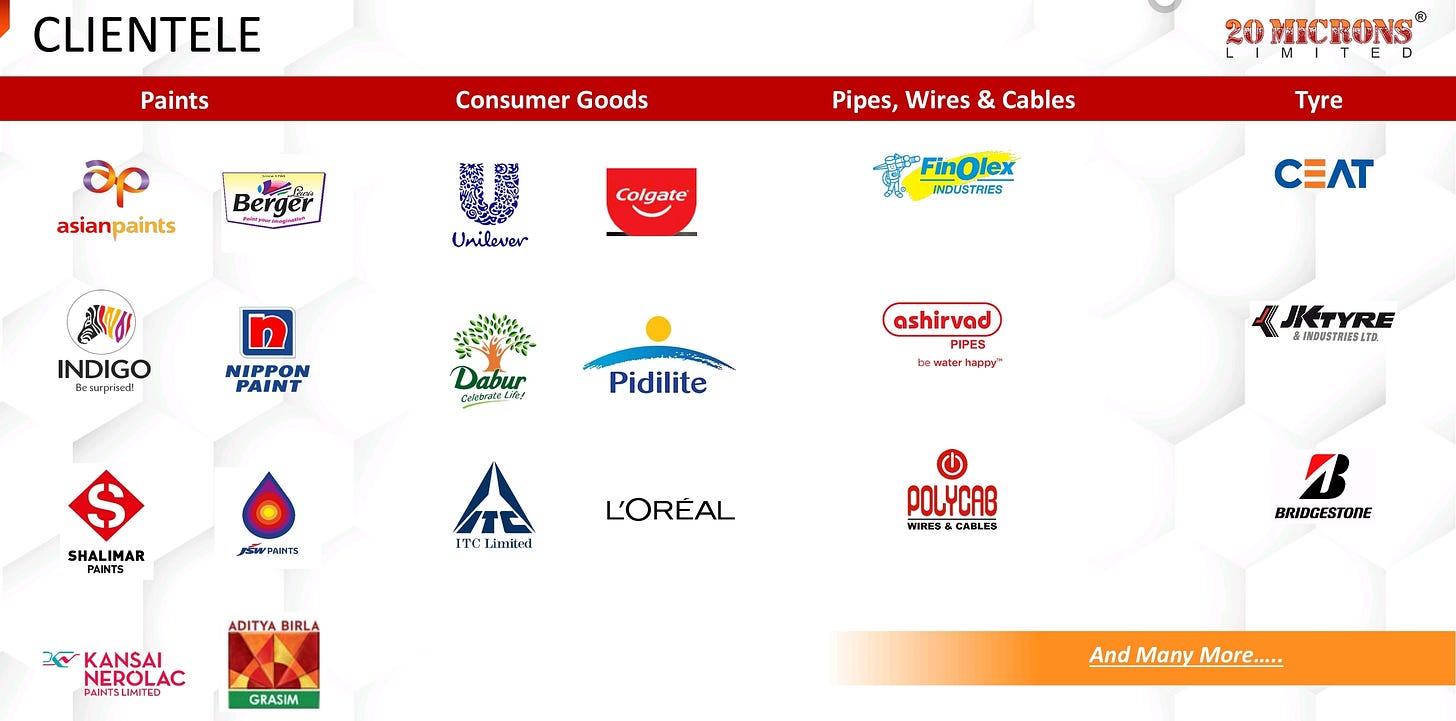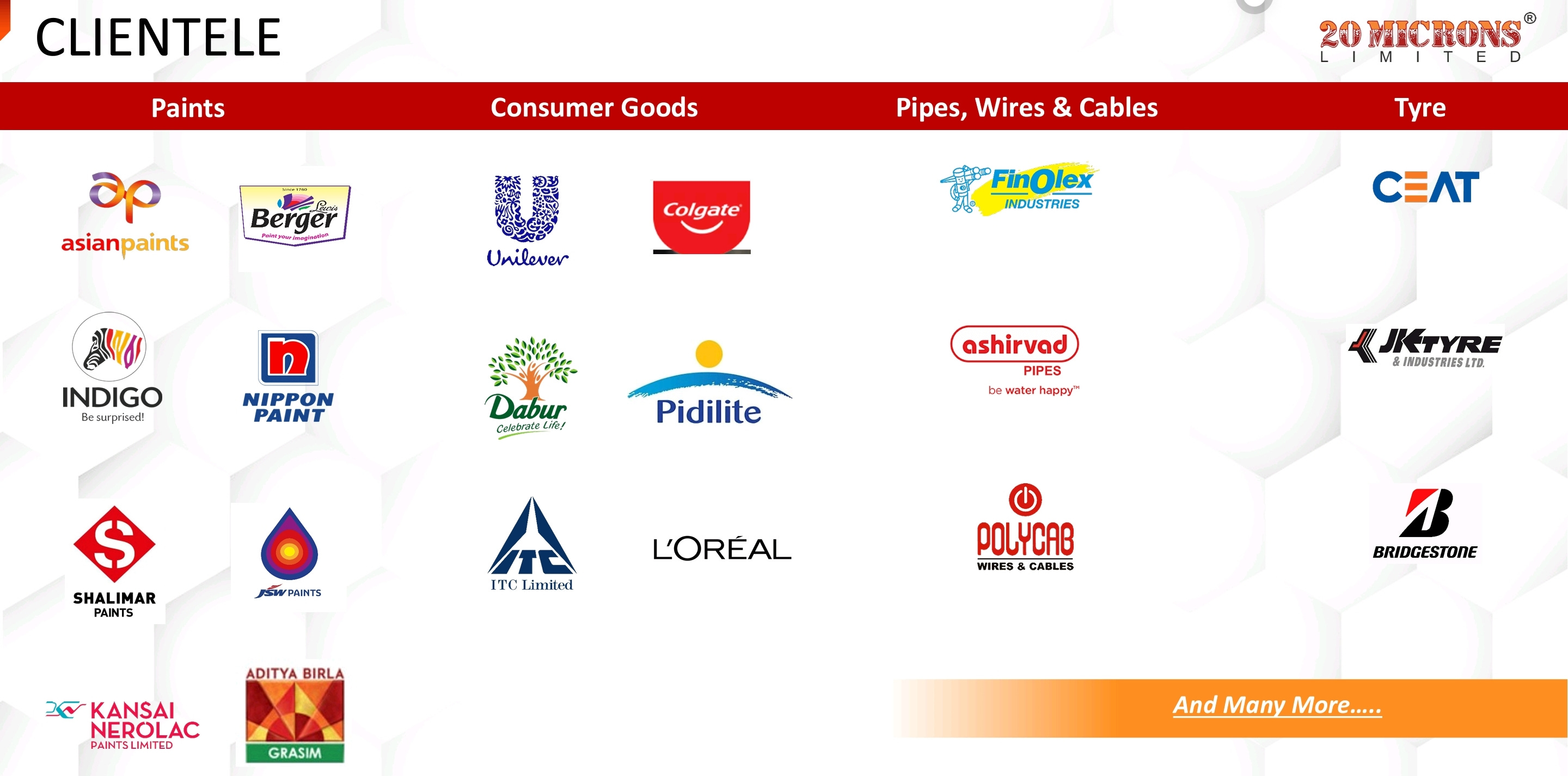20 Microns has built long standing relationship with clients like Asian Paints, Nerolac, Pidilite, ITC, Berger, Finolex, Kajaria among others.