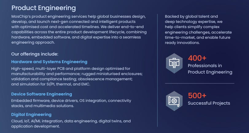 Software & system design contributes 20% to the topline. MosChip helps businesses with their hardware and software design needs.