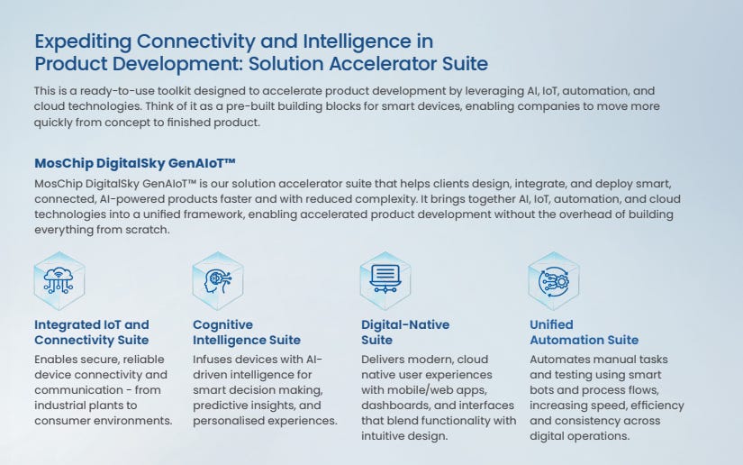 Digital Sky GenAIoT — MosChip is also working on a solution suite, that helps clients design, integrate, and deploy smart AI powered products faster and with reduced complexity. It brings together AI, IoT, Automation and Cloud technologies — enabling accelerated product development.