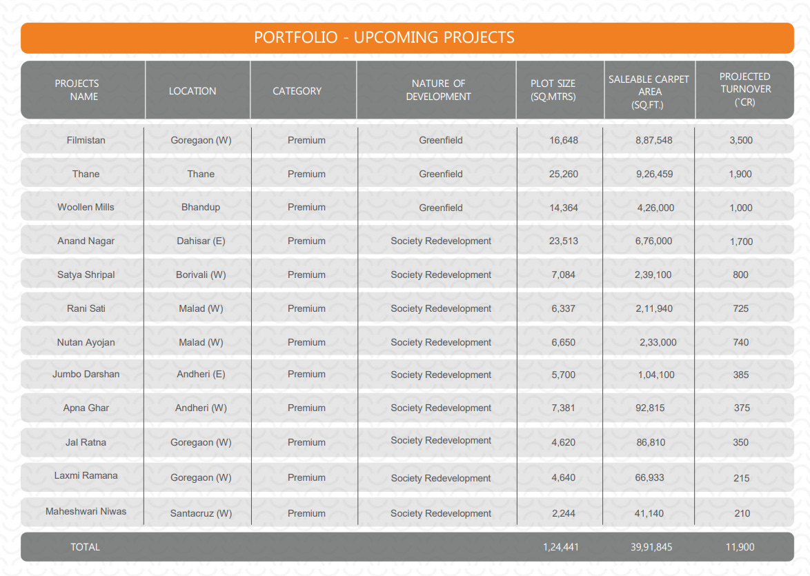 It has acquired key projects in Goregaon West (Filmistan), Thane & Bhandup and has multiple redevelopment projects lined up.